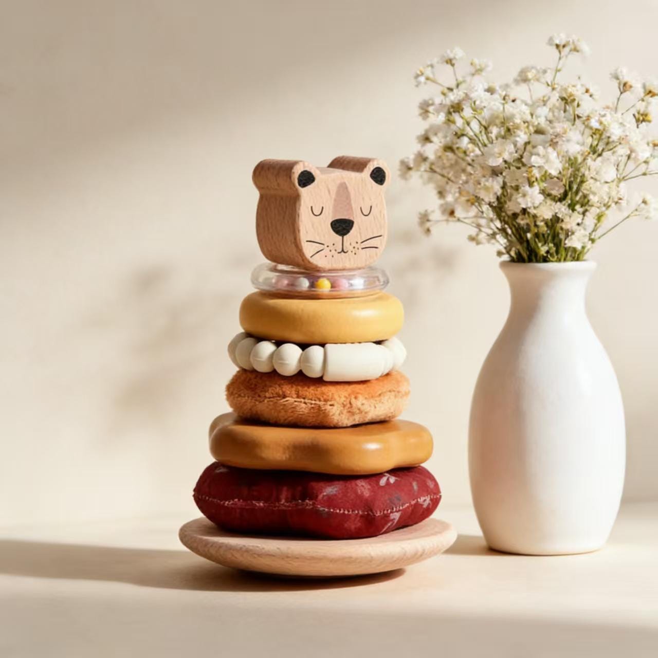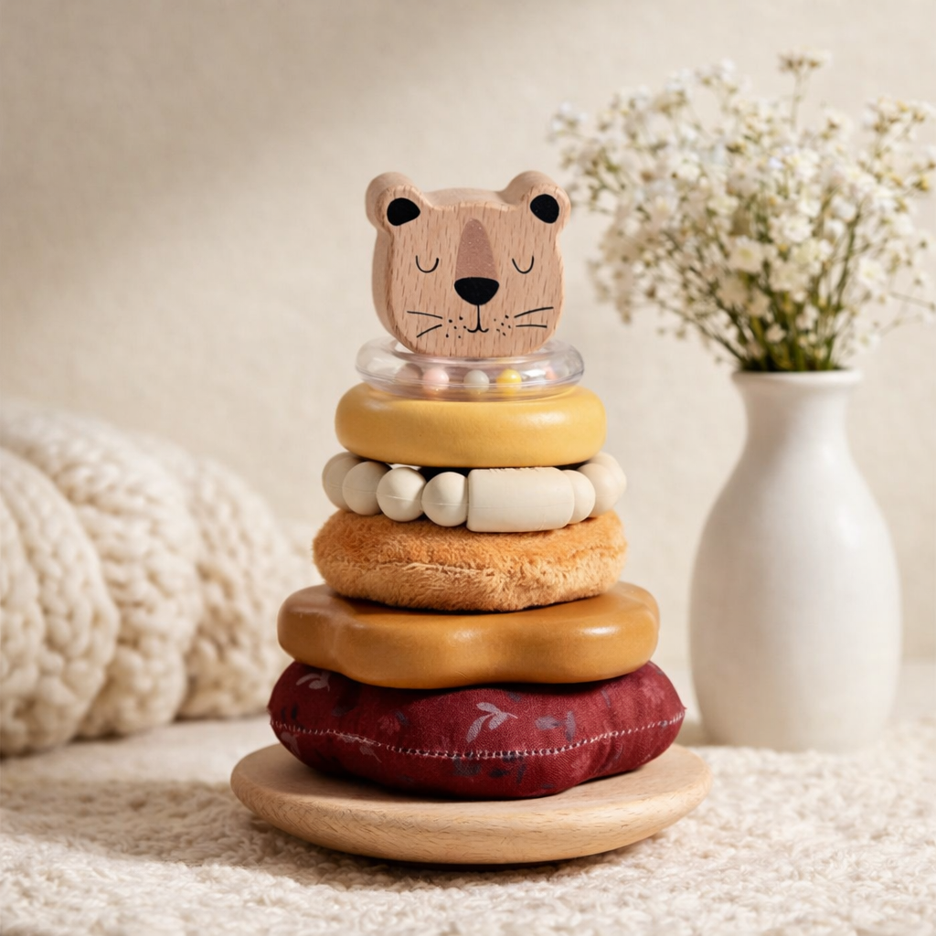 Featuring soft neutral stacking rings in a mix of wood, fabric, and sensory textures — topped with an adorable sleepy bear — this toy helps develop fine motor skills, hand-eye coordination, and problem-solving. The transparent rattle ring adds a subtle sensory element, keeping little ones engaged without overstimulation.