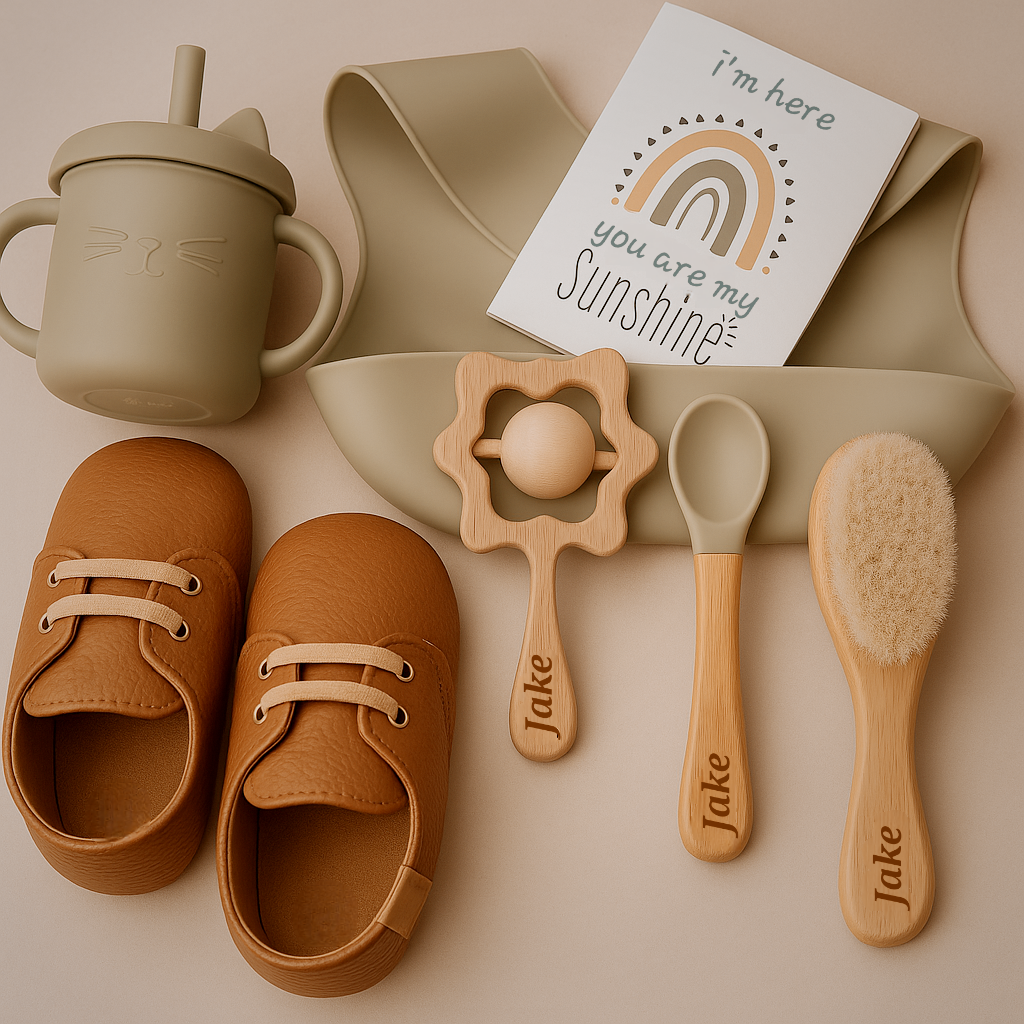 Looking for a unique gift for the little one? Our Green Gift Hamper is the perfect choice! This gorgeous set features a bib, sippy cup, milestone cards, beechwood brush and rattle. And to add a personal touch, we can engrave the baby's name on the brush and rattle. Give a gift that's both practical and special!