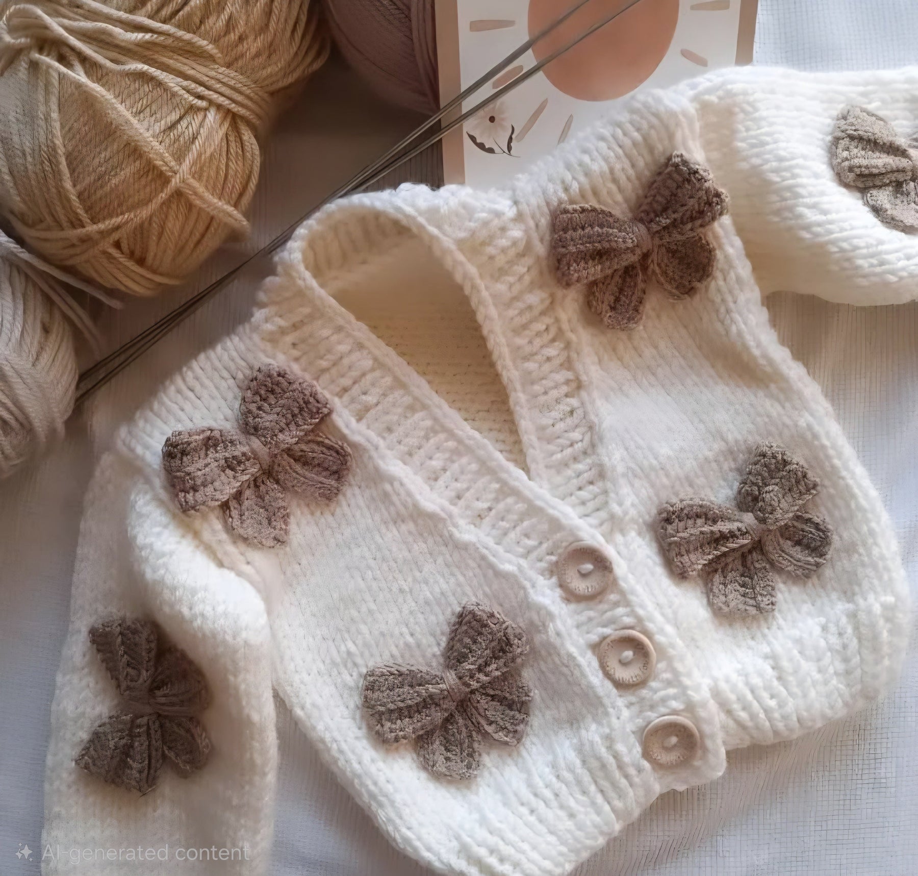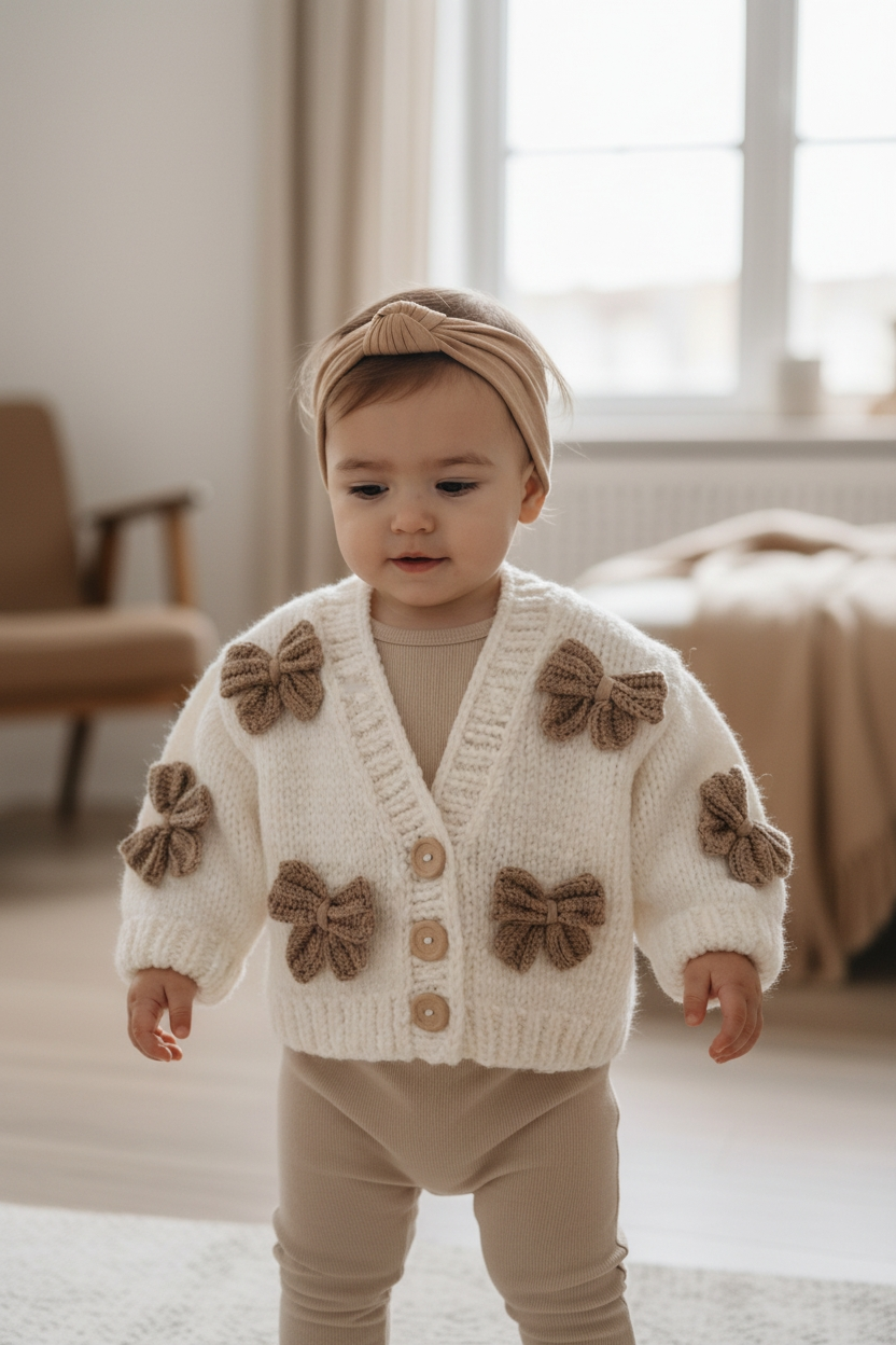 Featuring delicate knitted bow details and classic wooden buttons, this cardigan is perfect for everyday wear, special occasions, or gifting.