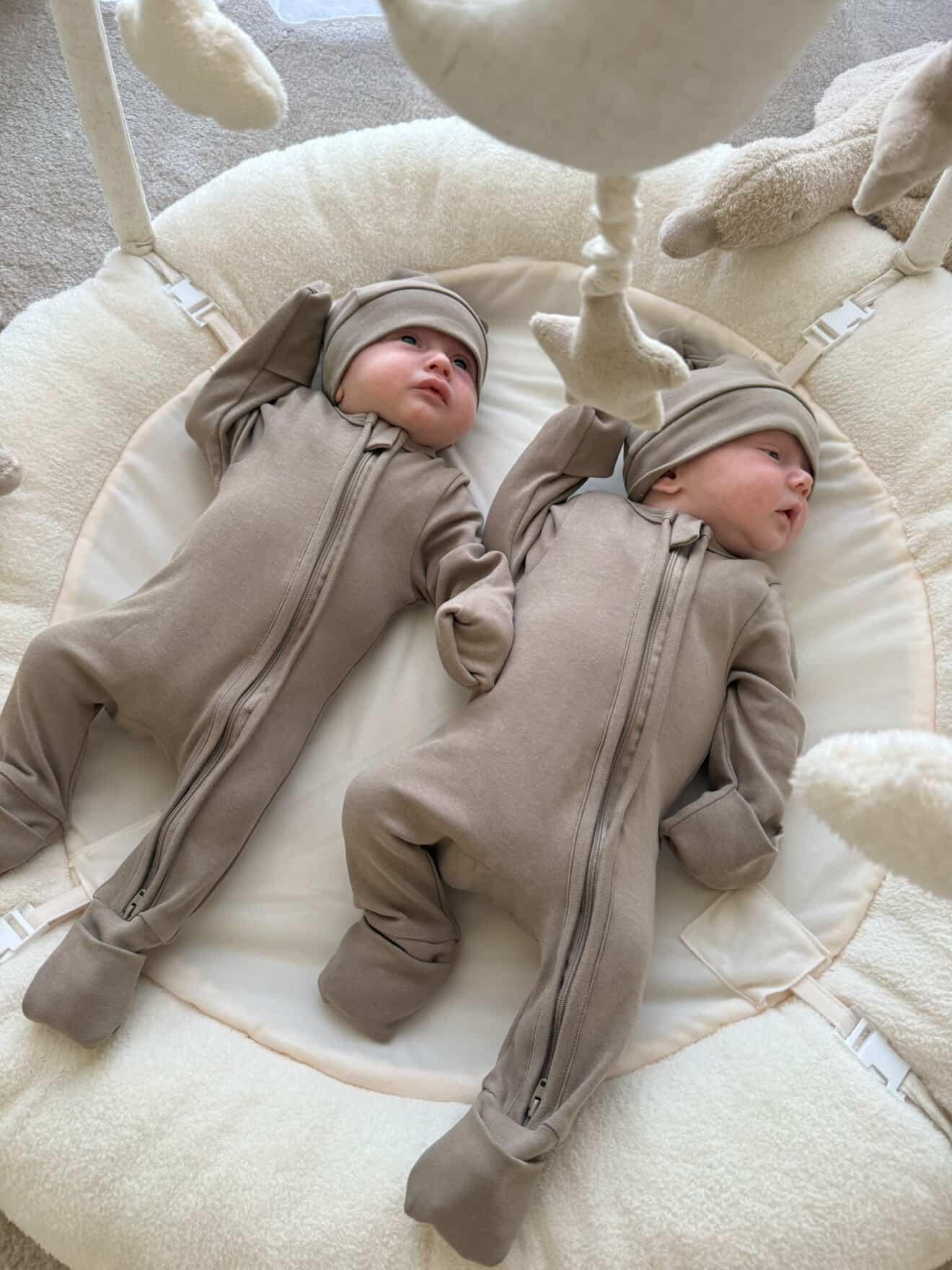 • Three full-length DOUBLE zipper rompers in warm, gender-neutral shades