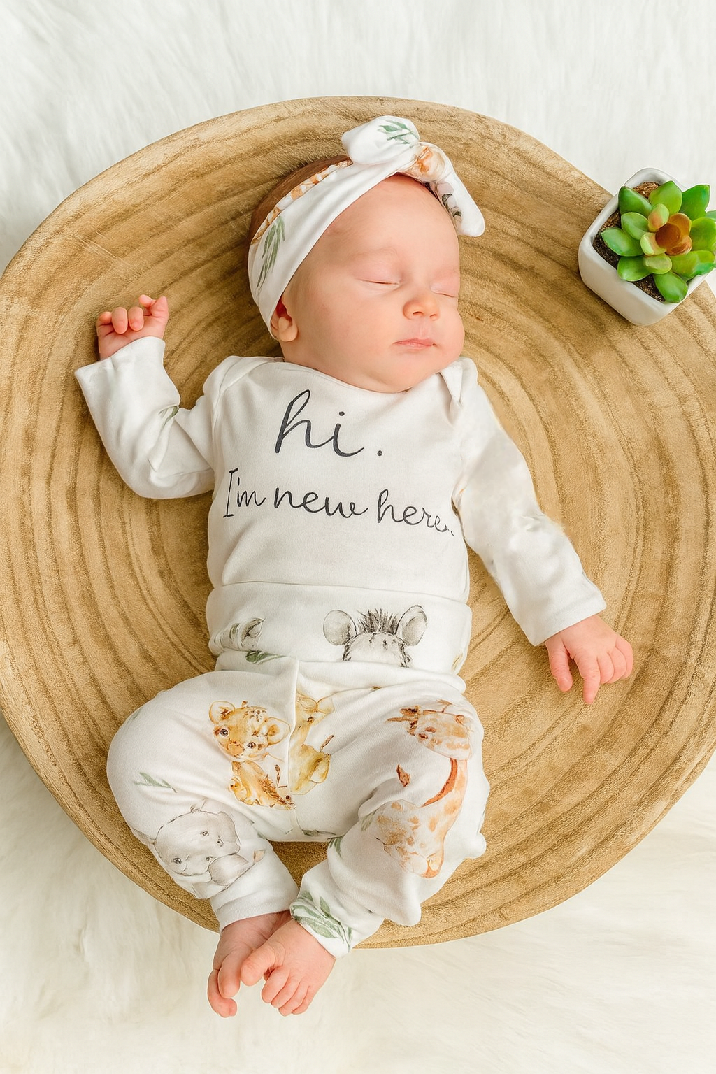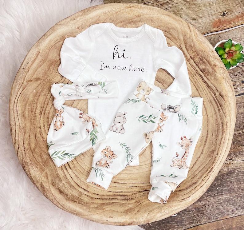 Welcome your bundle of joy in style with the Hi, I'm New Here Set! Show off your pride and joy with a special announcement onesie and accompany it with an adorable beanie hat and headband. Baby's first look is sure to make heads turn!