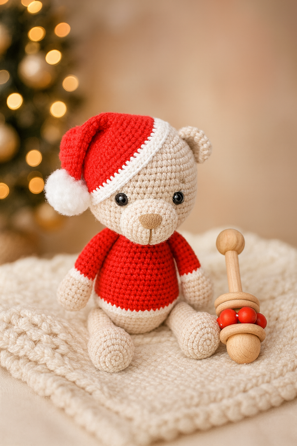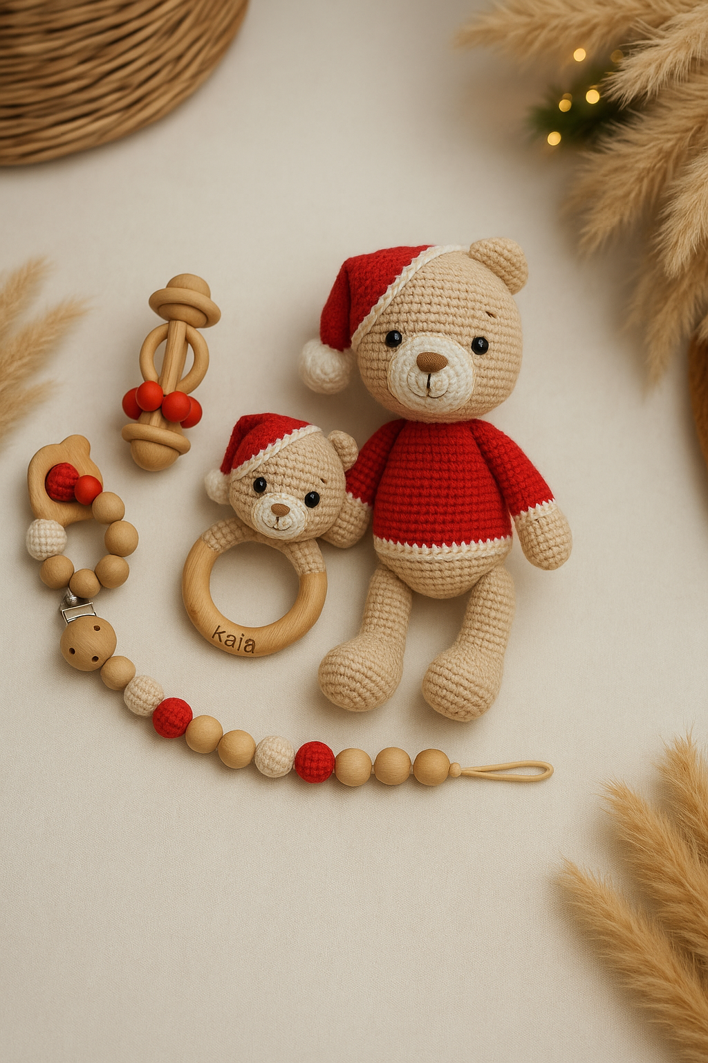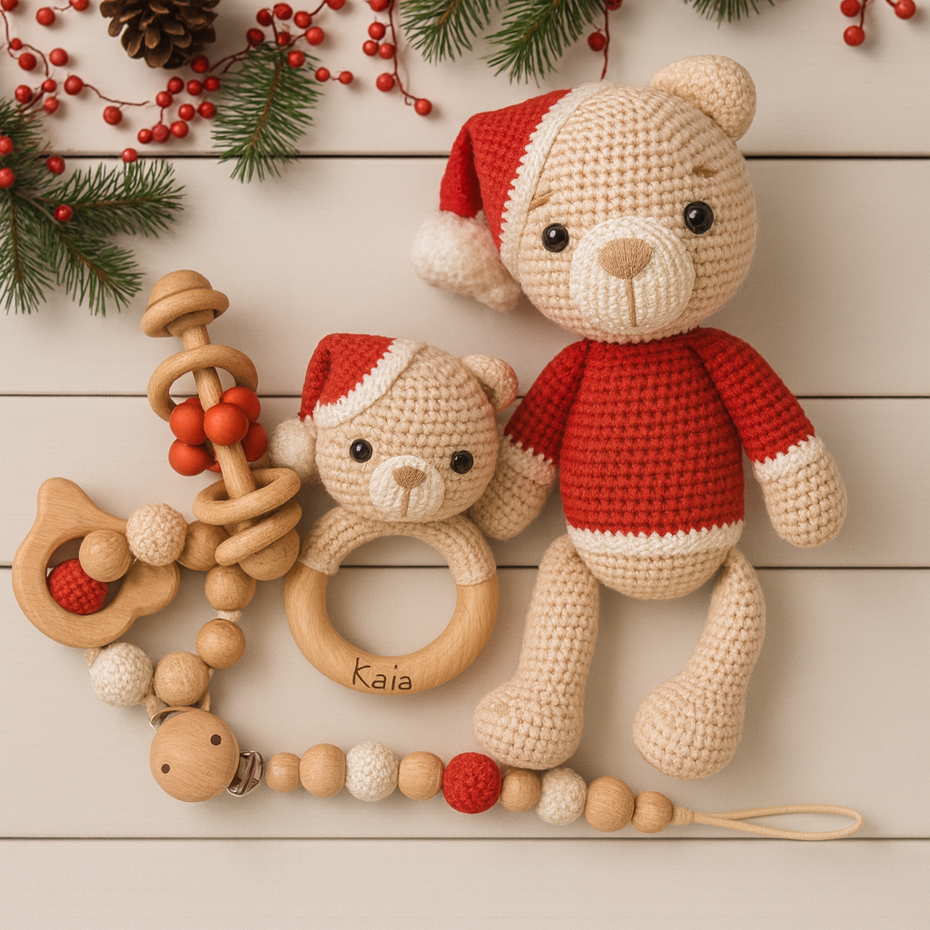 This gorgeous handmade crochet teddy set comes with a beautiful Teddy, santa bear rattle, rattle, teether bracelet and pacifier clip! Let your little one explore the holiday season with safe, fun, and stylish decorations that will last a lifetime! They'll love the festive look of these plushy friends!